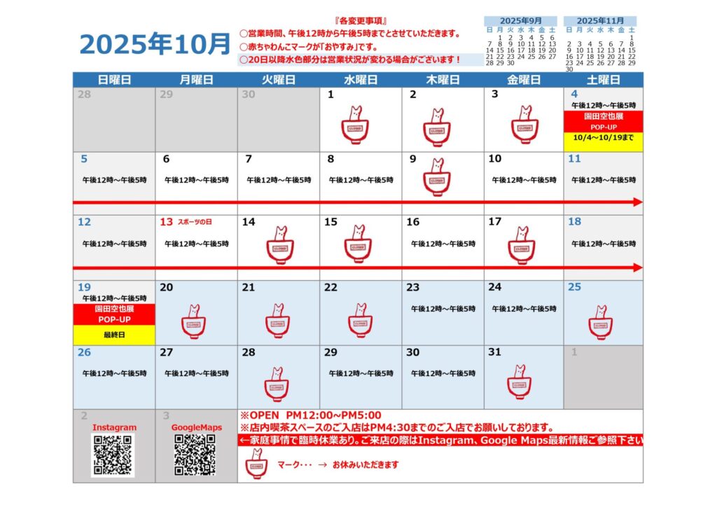いつもありがとうございます。すっかり遅くなってしまいましたが10月の営業予定投稿いたしました。