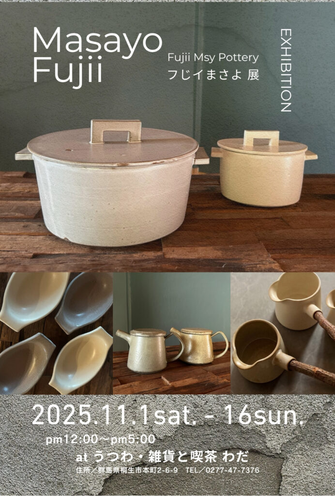2025年10月29日 / 最終更新日時 : 2025年10月29日 店長 お知らせ 『フじイまさよ展』開催いたします! こんにちは、わだです。 本日ご案内ですが、11/1より『フじイまさよ展』を行います。 これからの季節にぴったりなOvenware(耐熱作品)中心に、洗練されたシンプルで美しい作品たち。落ち着いた大人らしい風合い、そしてをご自身のご経験や色々な思考が詰まっている丁寧なうつわたちをお楽しみいただけたらと思います。 写真は小鍋、アヒージョカップ、ポット、ミルクパン。 何が届くか私も楽しみにしております。開催時はどうぞよろしくお願いいたします。 失礼いたします。 わだ Follow me!