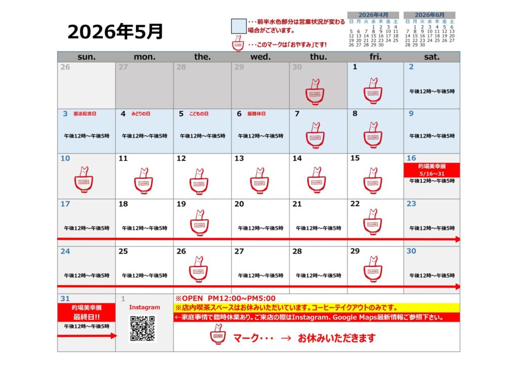 大変遅くなりましたが、5月営業カレンダー掲載いたしました🗓️